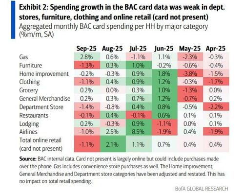 根据美国银行对信用卡和借记卡数据的汇总,9月份每个家庭的总卡消费比去年增长了2.0%。但如果看月度变化,经过季节性调整后,月度卡消费只增长了0.2%。而且一些品类的数据可不太好看,比如在线零售、百货商店、家具和服装,都出现了显著下降。
