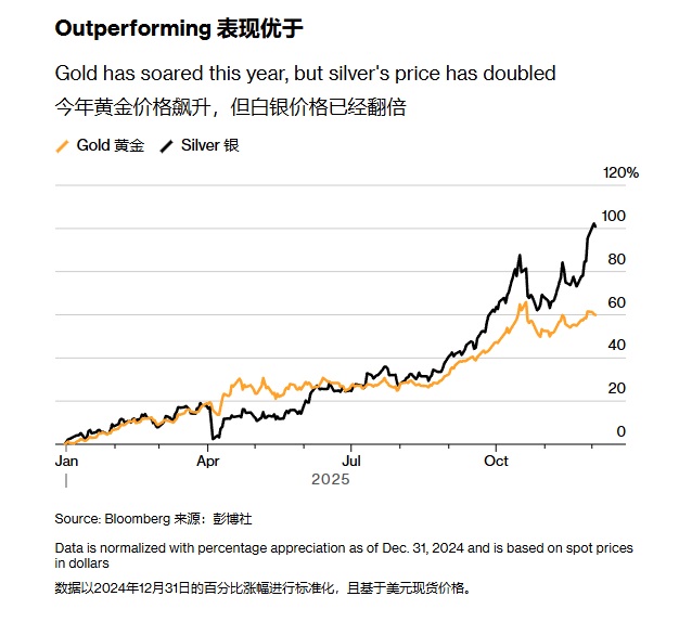 2025年,黄金因特朗普政府一系列非正统的经济政策引发避险潮而大涨60%,但真正让市场侧目的,却是白银——截至12月初,银价已翻倍,涨幅远超黄金。这轮飙升并非一时炒作,而是多重力量交织下的必然结果。